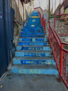 The steps were uneven and steep, and halfway up, I wondered if I should have just turned around. But as I got closer to the top, there was a set of stairs that were painted like the solar system. It had the phrase “la distancia perfecta entre el sol y nuestro planeta es amor”, which means the perfect distance between the sun and our planet is love. At the top of this hill, after the last bit of the climb, you could finally see from edge to sea, the entire city stretched out like a living map. The moment felt surreal, like I had stumbled into a secret reserved only for those willing to climb without knowing what was at the top. My legs were burning, and my chest was tight, but I was able to see the entire city. That moment symbolizes my journey here and what I must do in order to continue growing. To get to see that view, you must climb the staircase. In order to get to the top, you have to choose every day to keep climbing, to keep pushing yourself. I want to reach the top, I want to learn Spanish, but I have to keep choosing to climb the stairs every day to get that.